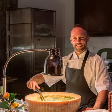 Pastagerecht bereid in een halve Parmigiano Reggiano (de kaas wordt geflambeerd en daarna wordt de pasta erin gemengd)