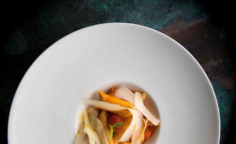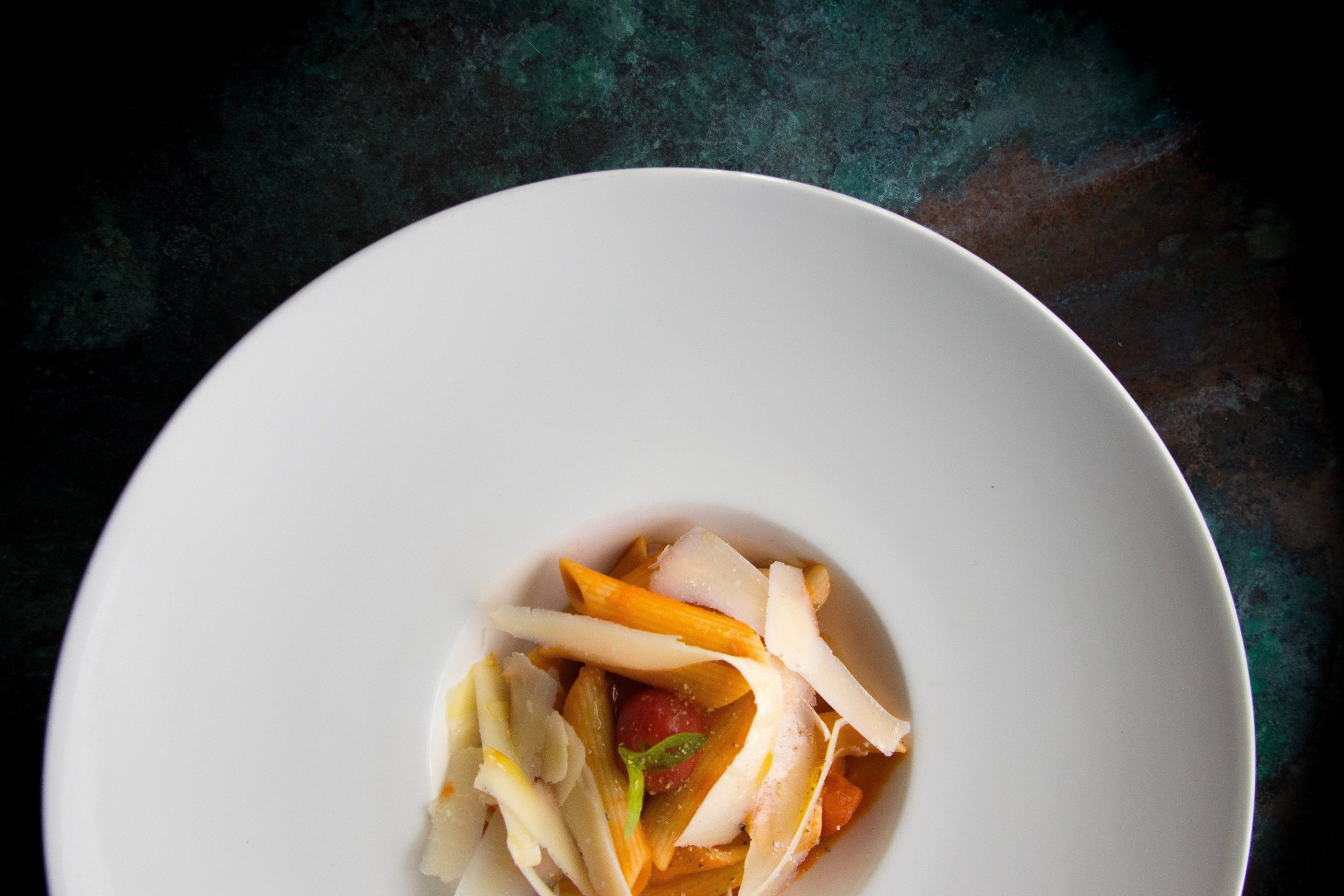 Parmigianofondue met mezzancolle-garnalen, bottarga en aardappelLinguine all'astice con Bisque Linguine met kreeft in bisquesaus